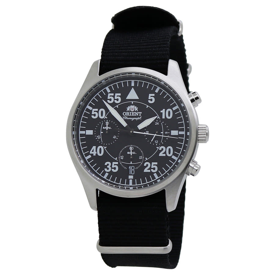Stainless steel case with a black nylon strap. Fixed stainless steel bezel. Black dial with luminous silver-tone hands. Arabic numeral minute markers (at 5 minute intervals). Minute markers around the outer rim. Dial Type: Analog. Luminescent hands and markers. Date display at the 6 o'clock position. Chronograph - three sub-dials displaying: 60 second, 30 minute and 24 hour. Quartz movement. Scratch resistant mineral crystal. Pull / push crown. Solid case back. Round case shape. Case size: 42 mm. Case thickness: 10 mm. Band width: 22 mm. Tang clasp. Water resistant at 50 meters / 165 feet. Functions: chronograph, date, hour, minute, second. Flight Series. Sport watch style. Watch label: Japan Movt. Orient Flight Chronograph Quartz Black Dial Mens Watch RA-KV0502B10B.