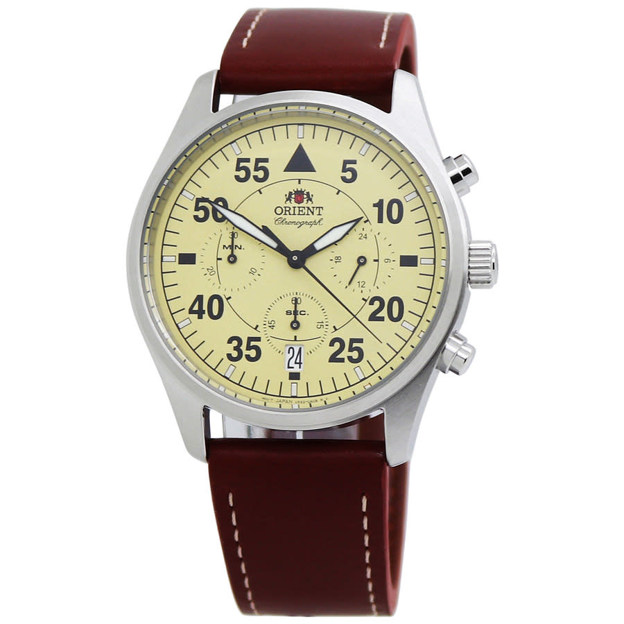 Silver-tone stainless steel case with a brown leather strap. Beige dial with silver-tone hands and Arabic numeral hour markers. Minute markers around the outer rim. Dial Type: Analog. Luminescent hands and markers. Date display at the 6 o'clock position. Chronograph - three sub-dials displaying: 60 second, 30 minute and 24 hour. Quartz movement. Scratch resistant mineral crystal. Pull / push crown. Solid case back. Round case shape, case size: 42 mm, case thickness: 10 mm. Band width: 22 mm. Buckle clasp. Water resistant at 50 meters / 165 feet. Functions: chronograph, date, hour, minute, second. Flight Series. Casual watch style. Watch label: Japan Movt. Orient Flight Chronograph Quartz Mens Watch RA-KV0503Y10B.