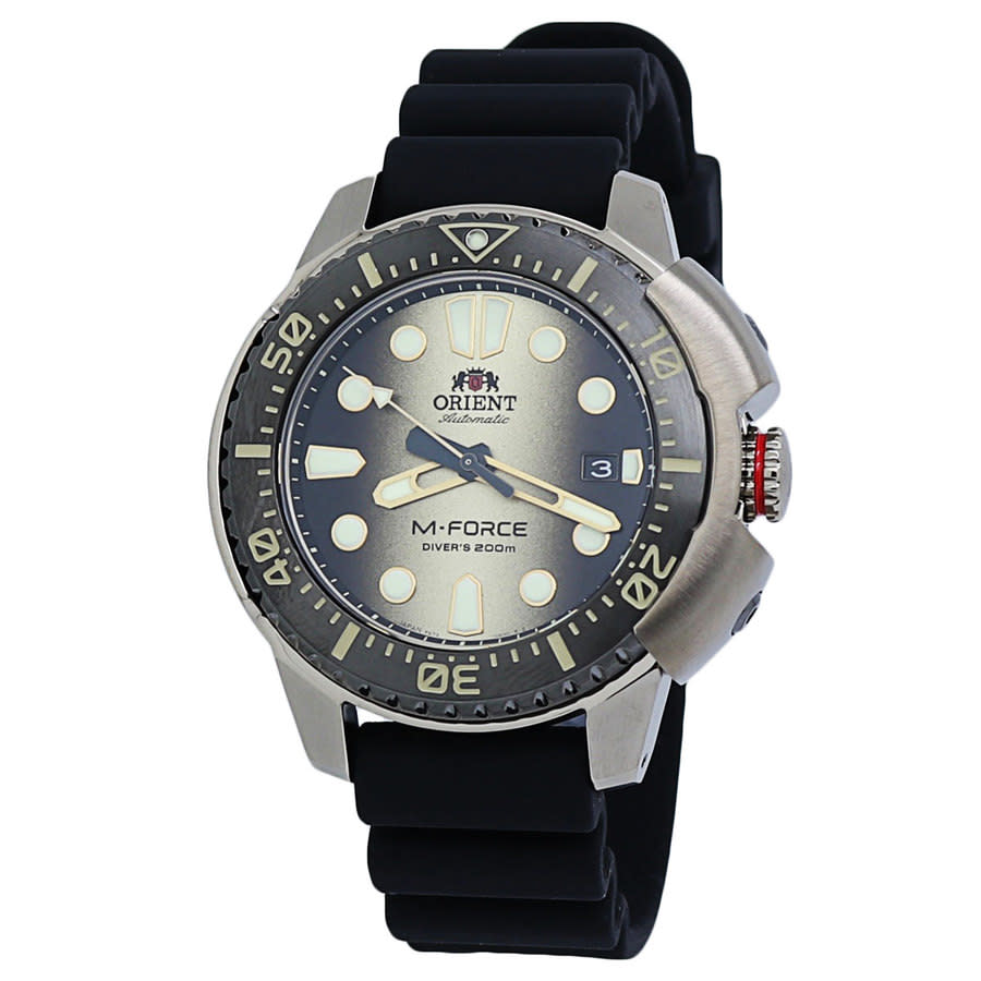 Silver-tone stainless steel case with a black silicone strap. Uni-directional rotating (120-click ) silver-tone stainless steel with a black ring bezel. Black dial with luminous gold-tone hands and dot hour markers. Minute markers around the outer rim. Dial Type: Analog. Luminescent hands and markers. Date display at the 3 o'clock position. Orient Calibre F6727 Automatic movement, containing 22 Jewels, bitting at 21600 vph, and has a power reserve of approximately 40 hours. Scratch resistant sapphire crystal. Screw down crown. Solid case back. Round case shape, case size: 45 mm, case thickness: 13.2 mm. Band width: 20 mm. Deployment with push button release clasp. Water resistant at 200 meters / 660 feet. Functions: date, hour, minute, second. M-force Series. Casual watch style. Watch label: Japan Movt. Orient M-Force Automatic Gold Dial Mens Watch RA-AC0L05G00B.