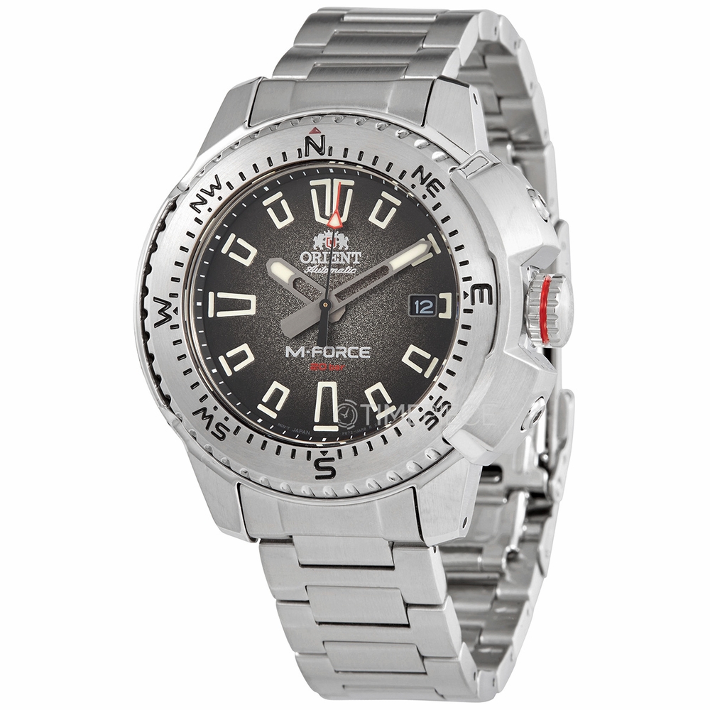 Silver-tone stainless steel case and bracelet. Bi-directional rotating silver-tone stainless steel bezel. Black dial with silver-tone hands and index hour markers. Minute markers around the outer rim. Dial Type: Analog. Luminescent hands and markers. Date display at the 3 o'clock position. Automatic movement. Scratch resistant sapphire crystal. Screw down crown. Round case shape, case size: 45 mm, case thickness: 12.8 mm. Band width: 20 mm. Fold over with double push button release clasp. Water resistant at 200 meters / 660 feet. Functions: date, hour, minute, second. M-force Series. Sport watch style. Orient M-Force Automatic Black Dial Mens Watch RA-AC0N01B10B.