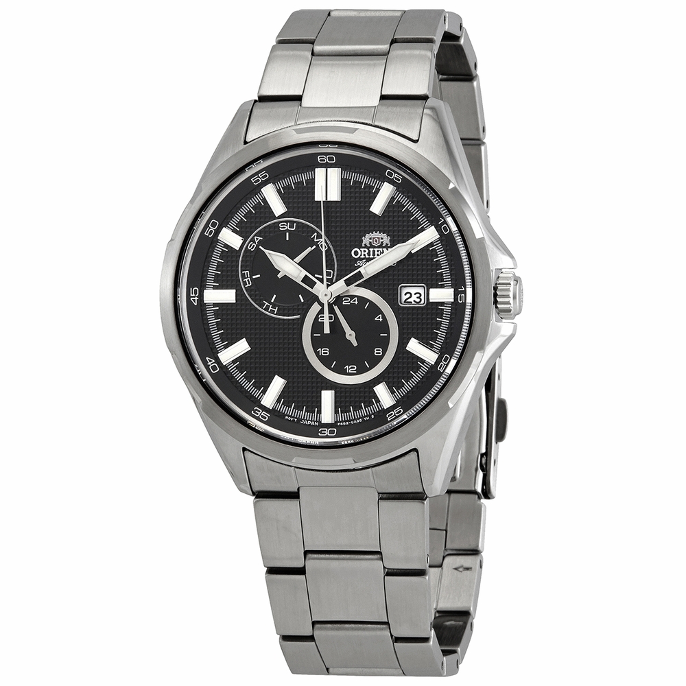 Stainless steel case with a stainless steel bracelet. Fixed stainless steel bezel. Black dial with luminous silver-tone sword-shaped hands and index hour markers. Minute markers. Arabic numeral minute markers (at 5 minute intervals) around the outer rim. Dial Type: Analog. Luminescent hands and markers. Date display at the 3 o'clock position. Two sub-dials displaying: day of the week and 24 hour. Orient calibre F6B22 automatic movement, containing 22 Jewels, bitting at 21600 vph, and has a power reserve of approximately 40 hours. Scratch resistant mineral crystal. Pull / push crown. Solid case back. Round case shape. Case size: 42.6 mm. Case thickness: 12 mm. Band width: 22 mm. Fold over clasp with a push button release. Water resistant at 100 meters / 330 feet. Functions: date, day, GMT, second time zone, hour, minute, second. Mechanical Series. Sport watch style. Watch label: Japan Movt. Orient Mechanical Automatic Black Dial Mens Watch RA-AK0602B10B.