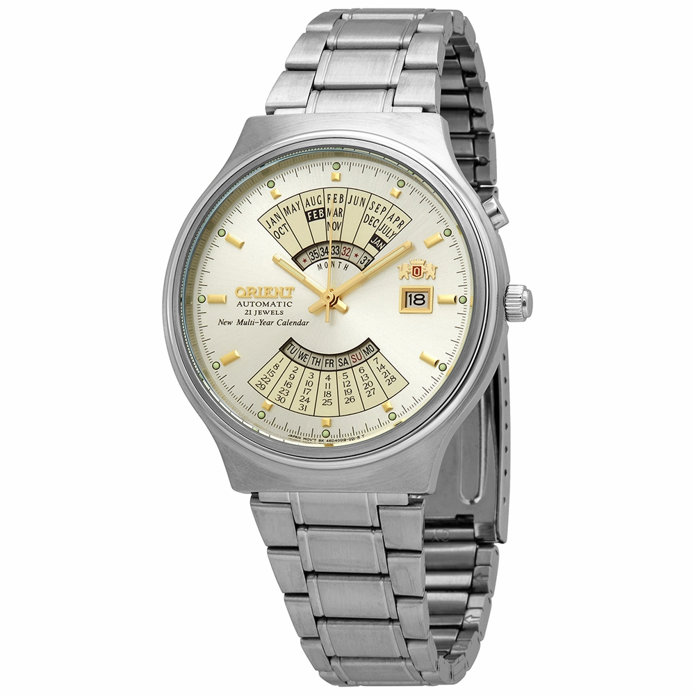Stainless steel case with a stainless steel bracelet. Fixed stainless steel bezel. Beige dial with luminous gold-tone hands and index hour markers. Perpetual calander markings. Minute markers around the outer rim. Dial Type: Analog. Luminescent hands and markers. Date display at the 3 o'clock position. Automatic movement. Scratch resistant sapphire crystal. Pull / push crown. Solid case back. Round case shape. Case size: 43 mm. Band width: 22 mm. Fold over clasp. Water resistant at 50 meters / 165 feet. Functions: date, hour, minute, second. Multi-year Series. Casual watch style. Watch label: Japan Movt. Orient Multi-Year Automatic Beige Dial Mens Watch FEU00002C.