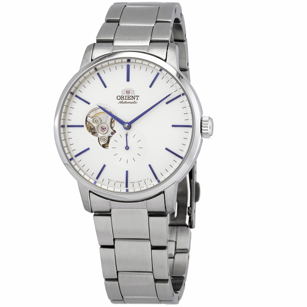 Stainless steel case with a stainless steel bracelet. Fixed stainless steel bezel. White (open heart) dial with blue hands and index hour markers. Minute markers around the outer rim. Dial Type: Analog. Orient calibre F6222 automatic movement, containing 24 Jewels, bitting at 21600 vph, and has a power reserve of approximately 40 hours. Scratch resistant mineral crystal. Pull / push crown. Transparent case back. Round case shape. Case size: 40 mm. Case thickness: 12 mm. Band width: 20 mm. Fold over clasp with a double push button release. Water resistant at 100 meters / 330 feet. Functions: hour, minute, second. Dress watch style. Watch label: Japan Movt. Orient Open Heart Automatic White Dial Mens Watch RA-AR0102S10B.