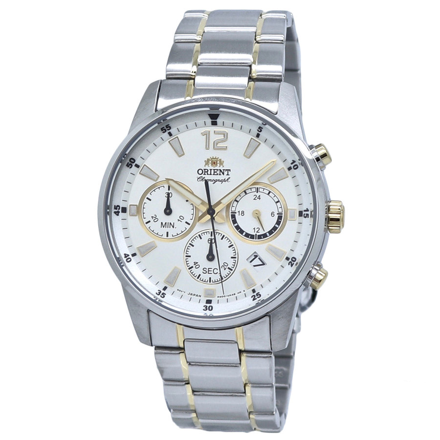 Silver-tone stainless steel case with a two-tone (silver-tone and yellow gold-tone) stainless steel bracelet. Fixed silver-tone stainless steel bezel. White dial with gold-tone hands and Arabic numeral & index hour markers. Minute markers around the outer rim. Dial Type: Analog. Between the 4 and 5 o'clock position. Quartz movement. Scratch resistant mineral crystal. Pull / push crown. Round case shape, case size: 42 mm, case thickness: 11 mm. Band width: 22 mm. Functions: date, hour, minute, second. Sport watch style. Watch label: Japan Movt. Orient Orient Sports Quartz White Dial Mens Watch RA-KV0003S10B.