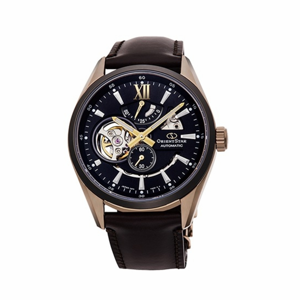 Rose gold-tone stainless steel case with a brown leather strap. Fixed black stainless steel bezel. Black dial with gold-tone hands and index hour markers. Minute markers around the outer rim. Dial Type: Analog. Luminescent hands and markers. Small seconds, power reserve indicator subdials. Orient Calibre F6F44 automatic movement. Scratch resistant sapphire crystal. Pull / push crown. Transparent see through case back. Round case shape, case size: 41 mm, case thickness: 12 mm. Folding buckle clasp. Water resistant at 100 meters / 330 feet. Functions: hour, minute, small second, power reserve indicator. Orient Star Series. Dress watch style. Watch label: Japan Movt. Orient Orient Star Automatic Black Dial Mens Watch RE-AV0115B00B.