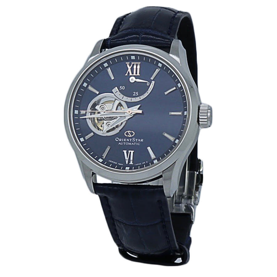 Stainless steel case with a blue leather strap. Fixed stainless steel bezel. Blue (open heart) dial with luminous silver-tone dauphine-style hands and index hour markers. Roman numerals appear at the 6 and 12 o'clock positions. Minute markers around the outer rim. Dial Type: Analog. Luminescent hands and markers. Power reserve indicator subdials. Orient calibre F6R42 automatic movement with a 50-hour power reserve. Scratch resistant sapphire crystal. Pull / push crown. Transparent case back. Round case shape. Case size: 39 mm. Case thickness: 12 mm. Deployment clasp with a push button release. Water resistant at 100 meters / 330 feet. Functions: hour, minute, second. Orient Star Series. Dress watch style. Watch label: Japan Movt. Orient Orient Star Automatic Blue Dial Mens Watch RE-AT0006L00B.