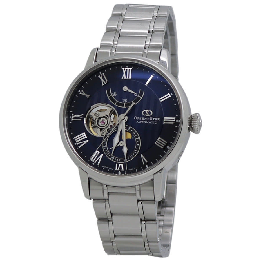 Stainless steel case with a stainless steel bracelet. Fixed stainless steel bezel. Blue (open heart) dial with silver-tone hands and Roman numeral hour markers. Minute markers around the outer rim. Dial Type: Analog. Luminescent hands and markers. Date display at the 6 o'clock position. Combination Date / moonphase sub-dial. Power reserve indicator. Automatic movement. Scratch resistant sapphire crystal. Pull / push crown. Transparent case back. Round case shape. Case size: 41 mm. Case thickness: 12 mm. Band width: 22 mm. Fold over clasp with a push button release. Water resistant at 50 meters / 165 feet. Functions: date, hour, minute, second. Orient Star Series. Dress watch style. Watch label: Japan Movt. Orient Orient Star Automatic Blue Dial Mens Watch RE-AY0103L00B.