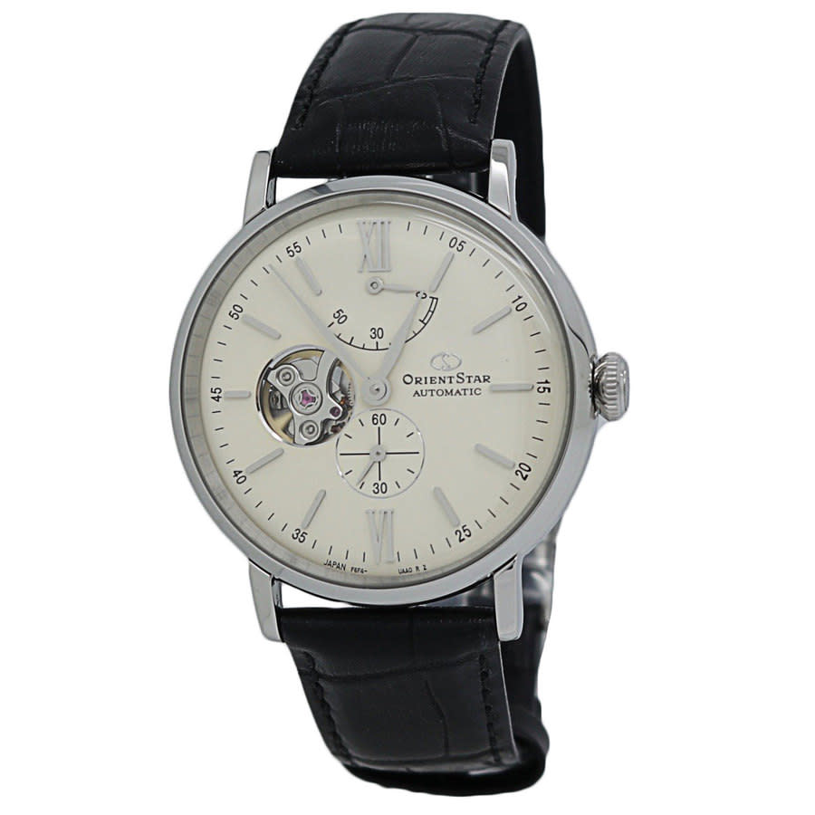 Silver-tone stainless steel case with a black leather strap. Fixed silver-tone stainless steel bezel. Champagne (open heart) dial with silver-tone leaf-style hands and index hour markers. Roman numerals appear at the 6 and 12 o'clock positions. Minute markers around the outer rim. Dial Type: Analog. Small seconds sub-dial. Power reserve indicator. Orient calibre F6F44 automatic movement with a 50-hour power reserve. Scratch resistant mineral crystal. Pull / push crown. Transparent case back. Round case shape. Case size: 40 mm. Case thickness: 13 mm. Tang clasp. Water resistant at 50 meters / 165 feet. Functions: hour, minute, second. Orient Star Series. Dress watch style. Watch label: Japan Movt. Orient Orient Star Automatic Champagne Dial Mens Watch RE-AV0002S00B.