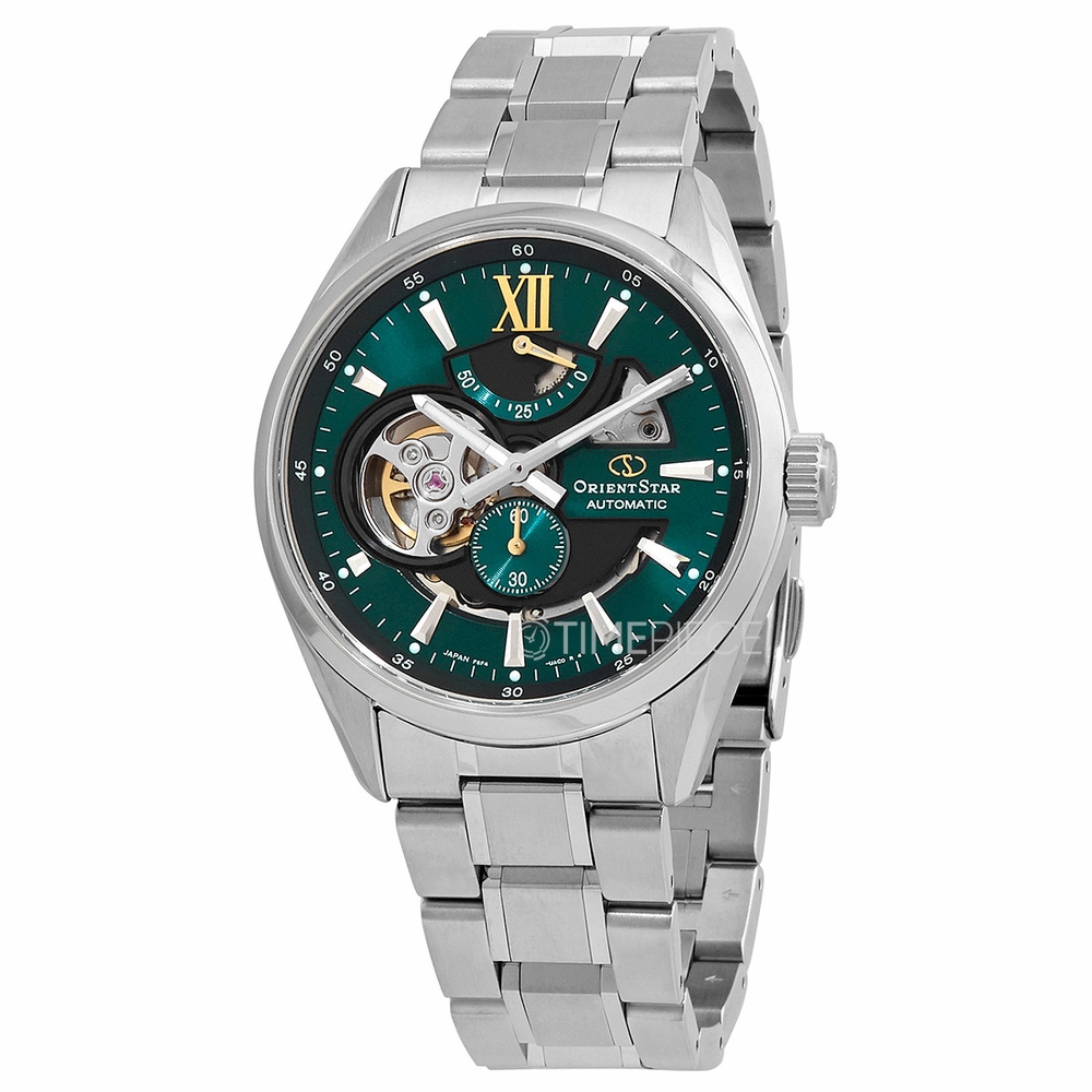 Stainless steel case with a stainless steel bracelet. Fixed stainless steel bezel. Green (open heart) dial with luminous silver-tone hands and index hour markers. A Roman numerals appear at the 12 o'clock position. Arabic numeral minute markers (at 5 minute intervals). Minute markers around the outer rim. Dial Type: Analog. Luminescent hands and markers. 60 seconds sub-dial. Power reserve display. Caliber: F6F44 automatic movement. Scratch resistant sapphire crystal. Pull / push crown. Transparent case back. Round case shape. Case size: 41 mm. Case thickness: 12 mm. Band width: 21 mm. Fold over clasp with a push button release. Water resistant at 100 meters / 330 feet. Functions: hour, minute, second. Orient Star Series. Dress watch style. Watch label: Japan Movt. Orient Orient Star Green Dial Mens Watch RE-AV0114E00B.