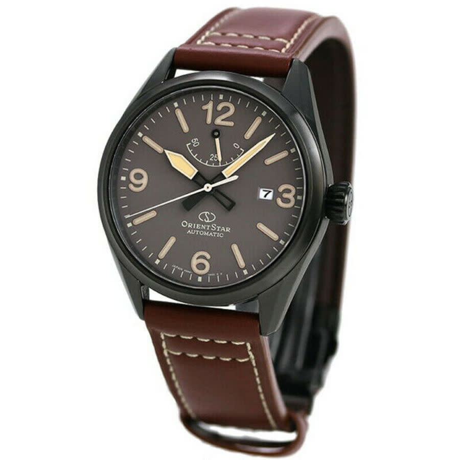 Black ion-plated stainless steel case with a brown leather strap. Fixed black ion-plated bezel. Grey dial with luminous silver-tone hands and index hour markers. Arabic numerals mark the 3, 6, 9 and 12 o'clock positions. Minute markers around the outer rim. Dial Type: Analog. Luminescent hands and markers. Date display at the 3 o'clock position. Power reserve indicator. Orient calibre F6N43 automatic movement, containing 22 Jewels, bitting at 21600 vph, and has a power reserve of approximately 50 hours. Scratch resistant sapphire crystal. Pull / push crown. Transparent case back. Round case shape. Case size: 41 mm. Case thickness: 12.1 mm. Band width: 21 mm. Fold over clasp. Water resistant at 100 meters / 330 feet. Functions: date, hour, minute, second. Sport watch style. Watch label: Japan Movt. Orient Orient Star Automatic Grey Dial Mens Watch RE-AU0202N00B.