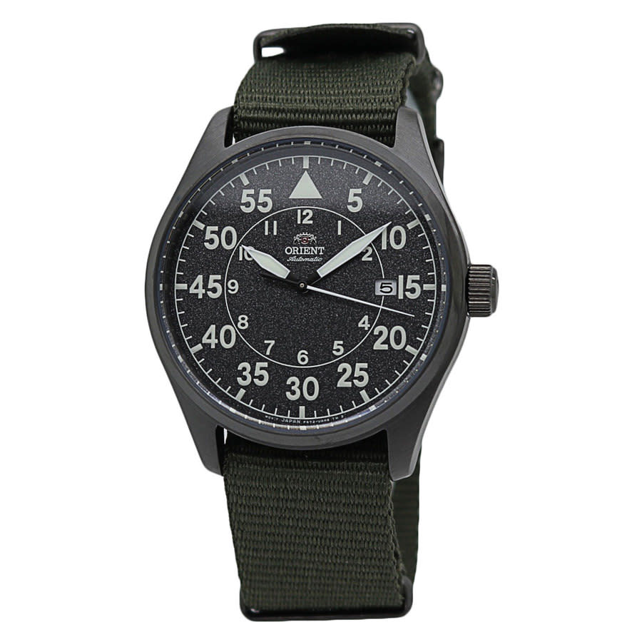 Black stainless steel case with a green nylon strap. Fixed black stainless steel bezel. Grey dial with silver-tone sword-shaped hands and Arabic numeral hour markers. Arabic numeral minute markers (at 5 minute intervals). Minute markers around the inner rim. Dial Type: Analog. Luminescent hands and markers. Date display at the 3 o'clock position. Orient calibre F6722 automatic movement, containing 22 Jewels, bitting at 21600 vph, and has a power reserve of approximately 40 hours. Scratch resistant mineral crystal. Screw down crown. Solid case back. Round case shape. Case size: 43 mm. Case thickness: 12 mm. Tang clasp. Water resistant at 100 meters / 330 feet. Functions: date, hour, minute, second. Pilot Series. Sport watch style. Watch label: Japan Movt. Orient Pilot Automatic Grey Dial Mens Watch RA-AC0H02N10B.