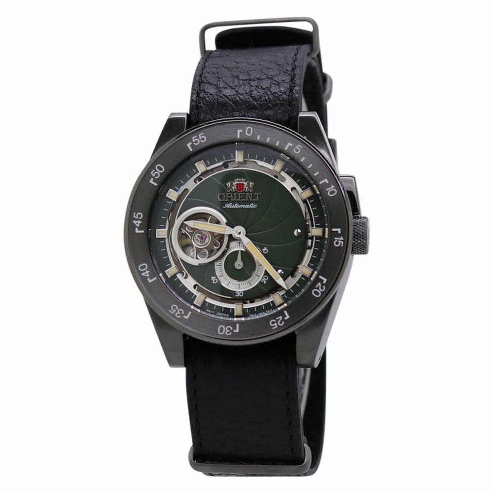 Black-plated stainless steel case with a black leather strap. Fixed black-plated bezel. Green (open heart) dial with luminous silver-tone hands and index hour markers. Minute markers around the outer rim. Dial Type: Analog. Luminescent hands and markers. Small seconds sub-dial. Automatic movement. Scratch resistant mineral crystal. Pull / push crown. Solid case back. Round case shape. Case size: 40.8 mm. Case thickness: 12.6 mm. Band width: 20 mm. Tang clasp. Water resistant at 50 meters / 165 feet. Functions: hour, minute, second. Retro Future Camera Series. Dress watch style. Orient Retro Future Camera Automatic Green Dial Mens Watch RA-AR0202E10B.
