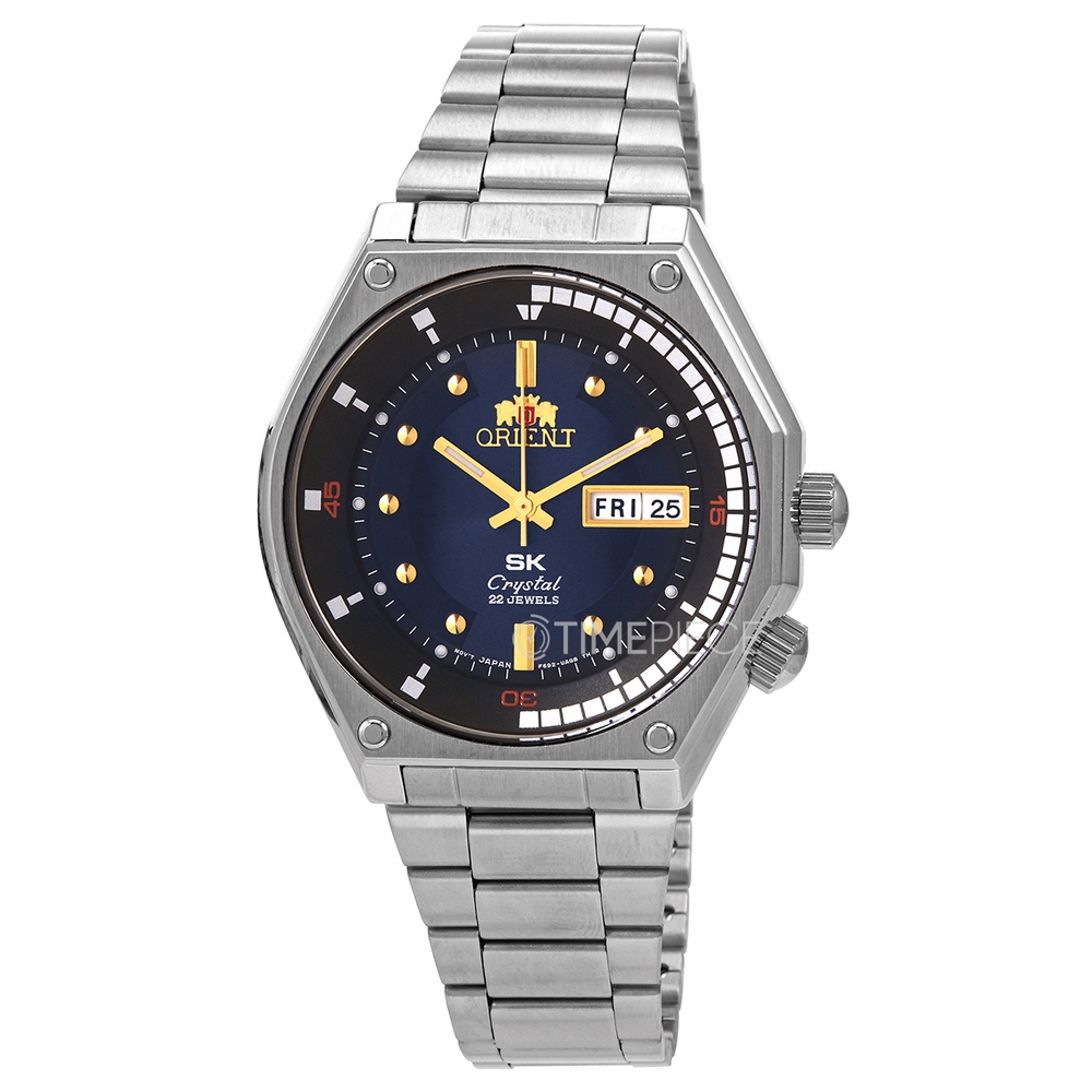 Stainless steel case with a stainless steel bracelet. Fixed stainless steel bezel. Blue dial with luminous gold-tone stick-shaped hands and dot hour markers. Minute markers around the outer rim. Dial Type: Analog. Luminescent hands and markers. Day of the week and date display at the 3 o'clock position. Orient calibre F6922 automatic movement, containing 22 Jewels, bitting at 21600 vph, and has a power reserve of approximately 40 hours. Scratch resistant mineral crystal. Pull / push crown. Solid case back. Round case shape. Case size: 41.7 mm. Case thickness: 12.6 mm. Band width: 18 mm. Fold over clasp. Water resistant at 50 meters / 165 feet. Functions: date, day, hour, minute, second. Sk Series. Casual watch style. Watch label: Japan Movt. Orient SK Automatic Blue Dial Mens Watch RA-AA0B03L19B.