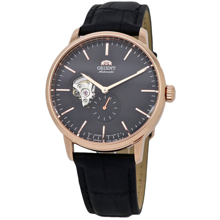 Rose gold-tone stainless steel case with a leather strap. Fixed rose gold-tone bezel. Black dial with rose gold-tone hands and index hour markers. Minute markers around the outer rim. Dial Type: Analog. One subdial displaying: small second. Orient Calibre F6S22 automatic movement with a 40-hour power reserve. Scratch resistant hardlex crystal. Pull / push crown. Transparent case back. Round case shape, case size: 46 mm, case thickness: 12 mm. Buckle clasp. Water resistant at 100 meters / 330 feet. Functions: hour, minute, second. Skeleton Series. Casual watch style. Watch label: Japan Movt. Orient Skeleton Automatic Black Dial Mens Watch RA-AR0103B10B.
