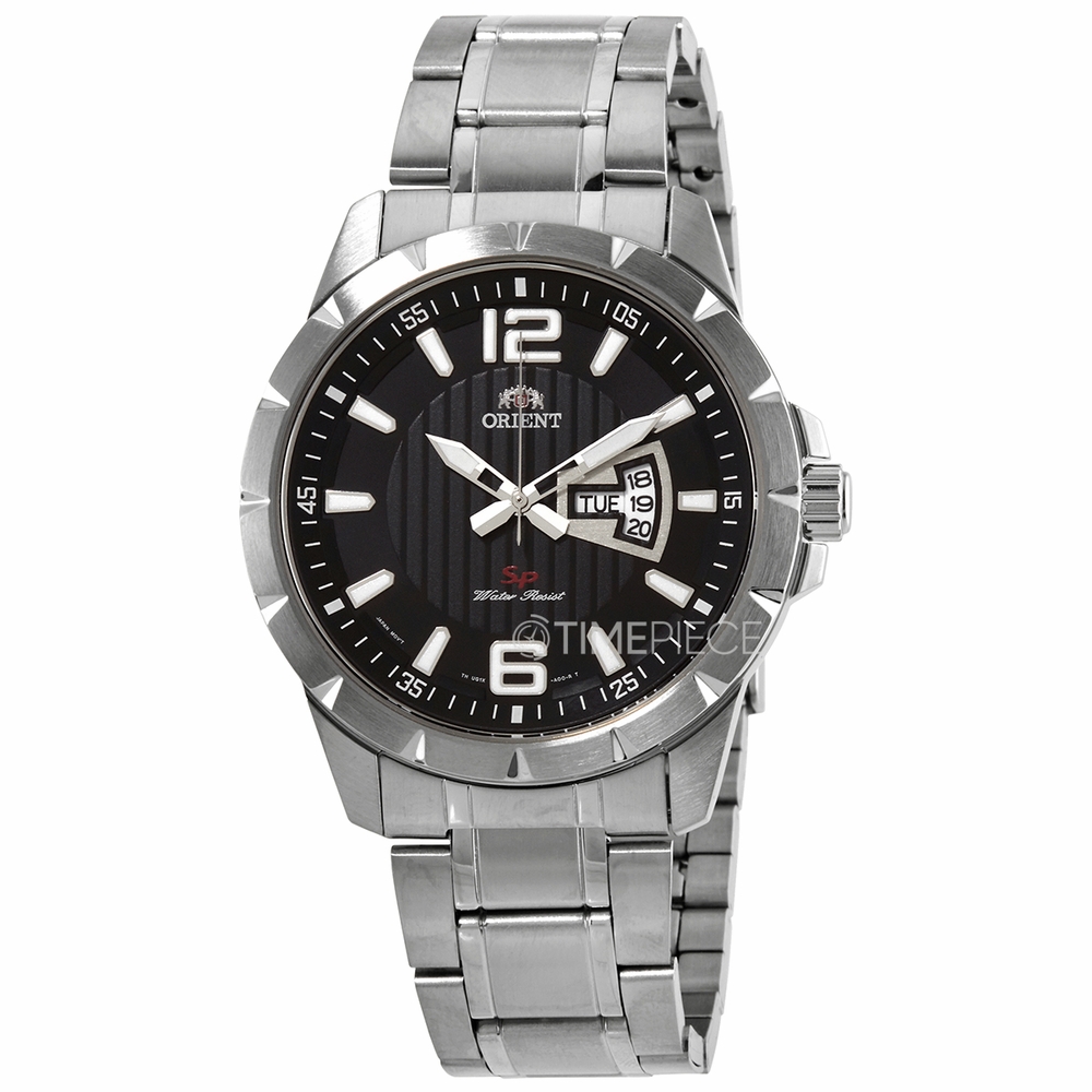 Stainless steel case with a stainless steel bracelet. Fixed stainless steel bezel. Black dial with luminous silver-tone hands and index hour markers. Arabic numerals appear at the 6 and 12 o'clock positions. Arabic numeral minute markers (at 5 minute intervals). Minute markers around the outer rim. Dial Type: Analog. Luminescent hands and markers. Day of the week and date display at the 3 o'clock position. Quartz movement. Scratch resistant mineral crystal. Screw down crown. Solid case back. Round case shape. Case size: 43 mm. Case thickness: 9 mm. Band width: 22 mm. Deployment clasp. Water resistant at 50 meters / 165 feet. Functions: date, day, hour, minute, second. Sp Collection Series. Casual watch style. Watch label: Japan Movt. Orient SP Collection Quartz Black Dial Mens Watch FUG1X004B9.