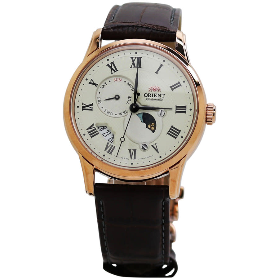 Rose gold-tone stainless steel case with a brown leather strap. Fixed rose gold-tone bezel. Champagne dial with black hands and Roman numeral hour markers. Minute markers around the outer rim. Dial Type: Analog. Date display between the 7 and 8 o'clock positions. Day of the week sub-dial. Sun / moon display. Automatic movement. Scratch resistant sapphire crystal. Pull / push crown. Transparent case back. Round case shape. Case size: 42.5 mm. Case thickness: 14 mm. Band width: 22 mm. Tang clasp. Water resistant at 50 meters / 165 feet. Functions: date, day, hour, minute, second. Sun And Moon Series. Dress watch style. Watch label: Japan Movt. Orient Sun and Moon Automatic Champagne Dial Mens Watch RA-AK0007S10B.