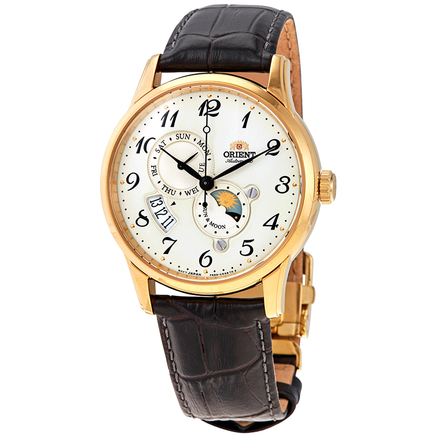 Gold-tone stainless steel case with a brown leather strap. Fixed gold-tone stainless steel bezel. White dial with black hands and Arabic numeral hour markers. Minute markers around the outer rim. Dial Type: Analog. Date display at the 8 o'clock position. Two - day, day/night indicator subdials. Orient Calibre F6B24 automatic movement with a 40-hour power reserve. Scratch resistant sapphire crystal. Transparent case back. Round case shape, case size: 42 mm, case thickness: 14 mm. Band width: 22 mm. Buckle clasp. Water resistant at 50 meters / 165 feet. Functions: date, day, hour, minute, second, sun and moon phase. Dress watch style. Watch label: Japan Movt. Orient Sun And Moon Automatic White Dial Mens Watch RA-AK0002S10B.