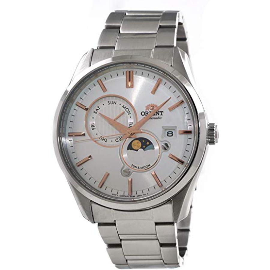 Stainless steel case with a stainless steel bracelet. Fixed smooth stainless steel bezel. White dial with rose gold-tone hands and index hour markers. Minute markers around the outer rim. Dial Type: Analog. Date display at the 3 o'clock position. Two displays showing: day of the week and sun-moon indicator. Orient calibre F6B24 automatic movement, containing 22 Jewels, bitting at 21600 vph, and has a power reserve of approximately 40 hours. Scratch resistant sapphire crystal. Pull / push crown. Transparent case back. Round case shape. Case size: 42 mm. Case thickness: 13 mm. Band width: 22 mm. Fold over clasp with a push button release. Water resistant at 50 meters / 165 feet. Functions: date, hour, minute, second. Sun And Moon Series. Dress watch style. Watch label: Japan Movt. Orient Sun and Moon Automatic White Dial Mens Watch RA-AK0301S10B.