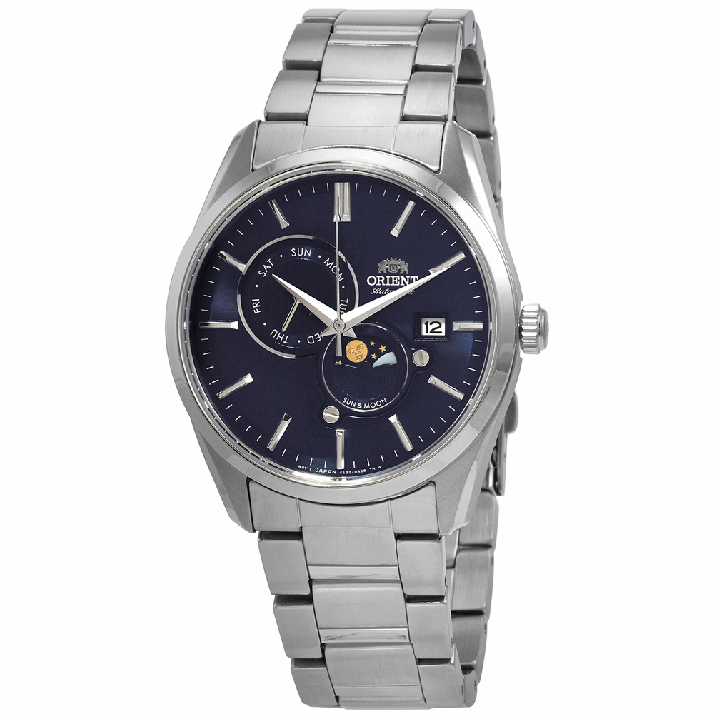Stainless steel case with a stainless steel bracelet. Fixed stainless steel bezel. Blue dial with silver-tone dauphine-style hands and index hour markers. Minute markers around the outer rim. Dial Type: Analog. Date display at the 3 o'clock position. Two sub-dials displaying: day of the week and sun & moon phase. Orient calibre F6B24 automatic movement, containing 22 Jewels, bitting at 21600 vph, and has a power reserve of approximately 40 hours. Scratch resistant sapphire crystal. Pull / push crown. Transparent case back. Round case shape. Case size: 41.5 mm. Case thickness: 13 mm. Band width: 22 mm. Fold over clasp with a safety release. Water resistant at 50 meters / 165 feet. Functions: date, day, hour, minute, second. Sun & Moon Series. Dress watch style. Watch label: Japan Movt. Orient Sun Moon Automatic Blue Dial Mens Watch RA-AK0303L10B.