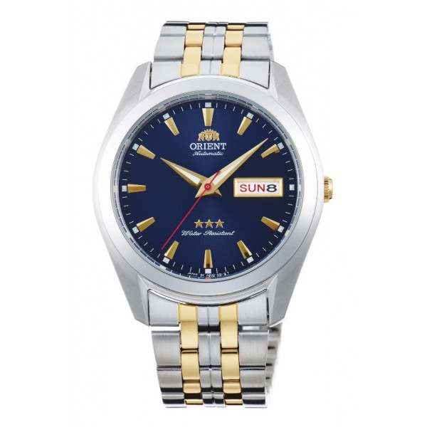 Silver-tone stainless steel case with a two-tone (silver-tone and yellow gold-tone) stainless steel bracelet. Fixed silver-tone stainless steel bezel. Blue dial with yellow gold-tone hands and index hour markers. Minute markers around the outer rim. Dial Type: Analog. Luminescent hands and markers. Day of the week and date display at the 3 o'clock position. Automatic movement. Scratch resistant mineral crystal. Pull / push crown. Solid case back. Round case shape, case size: 43 mm, case thickness: 8.5 mm. Deployment with push button release clasp. Water resistant at 30 meters / 100 feet. Functions: date, day, hour, minute, second. Tri Star Series. Casual watch style. Watch label: Swiss Made. Orient Tri Star Automatic Blue Dial Mens Watch RA-AB0029L19B.