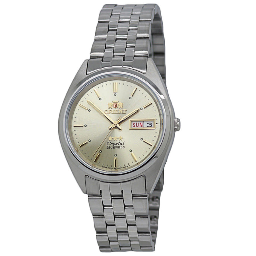 Stainless steel case with a stainless steel bracelet. Fixed stainless steel bezel. Champagne dial with luminous gold-tone pencil-style shape hands and index hour markers. Minute markers around theouter rim. Dial Type: Analog. Luminescent hands and markers. Day of the week and date display at the 3 o'clock position. Automatic movement. Scratch resistant mineral crystal. Pull / push crown. Solid case back. Round case shape. Case size: 37 mm. Case thickness: 11 mm. Band width: 19 mm. Fold over clasp. Water resistant at 30 meters / 100 feet. Functions: date, day, hour, minute, second. Tri Star Series. Casual watch style. Watch label: Japan Movt. Orient Tri Star Automatic Champagne Dial Mens Watch FAB0000AC9.