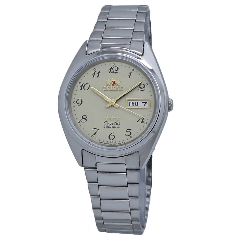 Silver-tone stainless steel case with a silver-tone stainless steel bracelet. Fixed silver-tone stainless steel bezel. Champagne dial with gold-tone hands and Arabic numeral hour markers. Minute markers around the outer rim. Dial Type: Analog. Date display at the 3 o'clock position. Automatic movement. Scratch resistant mineral crystal. Pull / push crown. Solid case back. Round case shape, case size: 37 mm, case thickness: 11 mm. Band width: 19 mm. Buckle clasp. Water resistant at 30 meters / 100 feet. Functions: date, day, hour, minute, second. Casual watch style. Watch label: Japan Movt. Orient Tri Star Automatic Champagne Dial Unisex Watch FAB00003C9.