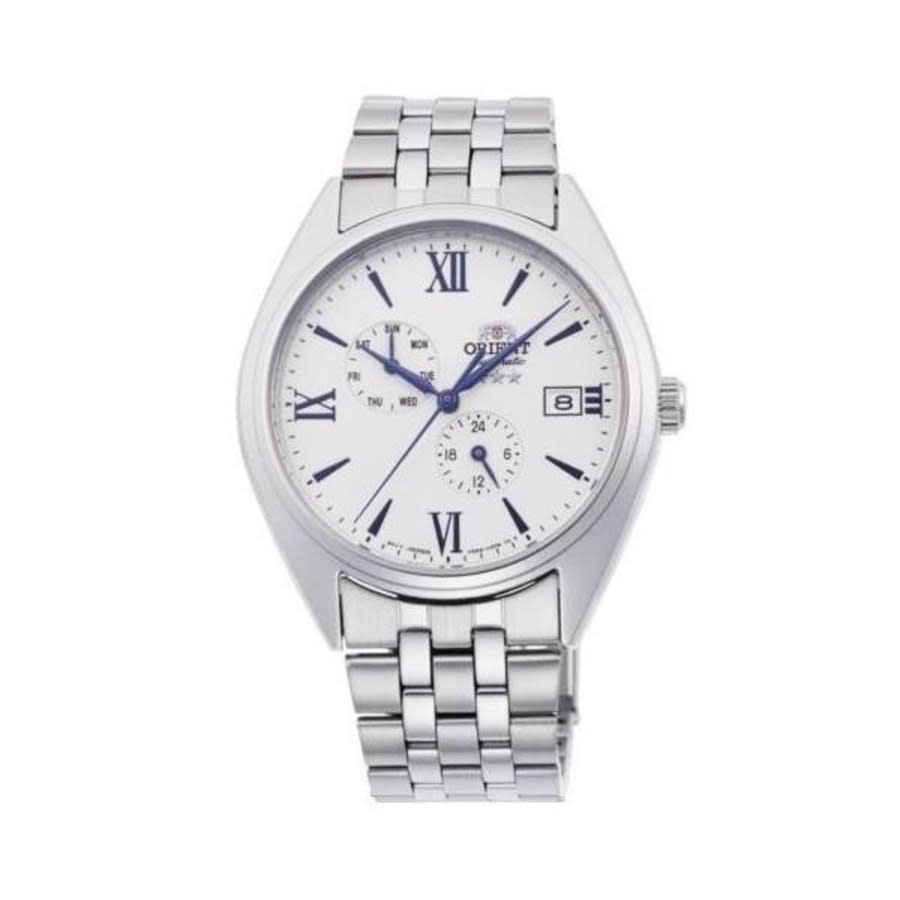 Stainless steel case with a stainless steel bracelet. Fixed stainless steel bezel. White dial with blue hands and index hour markers. Roman numerals mark the 3, 6, 9 and 12 o'clock positions. Minute markers around the outer rim. Dial Type: Analog. Date display at the 3 o'clock position. Two sub-dials displaying: 24 hours and day of the week. Orient caliber F6B22 automatic movement with a 40-hour power reserve. Scratch resistant mineral crystal. Pull / push crown. Solid case back. Round case shape. Case size: 39.5 mm. Case thickness: 11.2 mm. Band width: 20 mm. Fold over clasp. Water resistant at 30 meters / 100 feet. Functions: date, hour, minute, second. Tri Star Series. Casual watch style. Orient Tri Star Automatic White Dial Mens Watch RA-AK0506S10B.