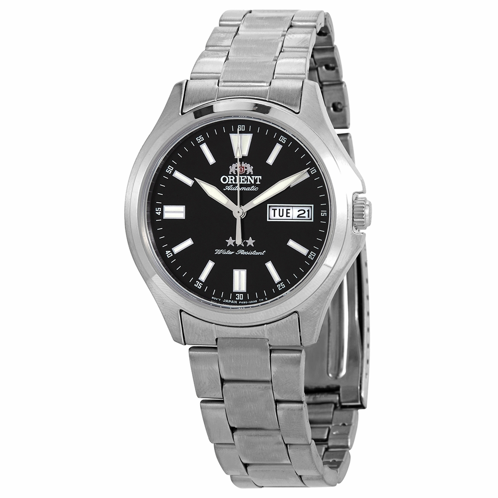 Stainless steel case with a stainless steel bracelet. Fixed stainless steel bezel. Black dial with luminous silver-tone hands and index hour markers. Arabic numeral minute markers (at 5 minute intervals). Minute markers around the outer rim. Dial Type: Analog. Luminescent hands and markers. Day of the week and date display at the 3 o'clock position. Orient calibre F4902 automatic movement, containing 22 Jewels, bitting at 21600 vph, and has a power reserve of approximately 40 hours. Scratch resistant mineral crystal. Pull / push crown. Transparent case back. Round case shape. Case size: 40 mm. Case thickness: 11.2 mm. Band width: 20 mm. Fold over clasp with a push button release. Water resistant at 30 meters / 100 feet. Functions: date, day, hour, minute, second. Tristar Series. Casual watch style. Watch label: Japan Movt. Orient TriStar Automatic Black Dial Mens Watch RA-AB0F07B.