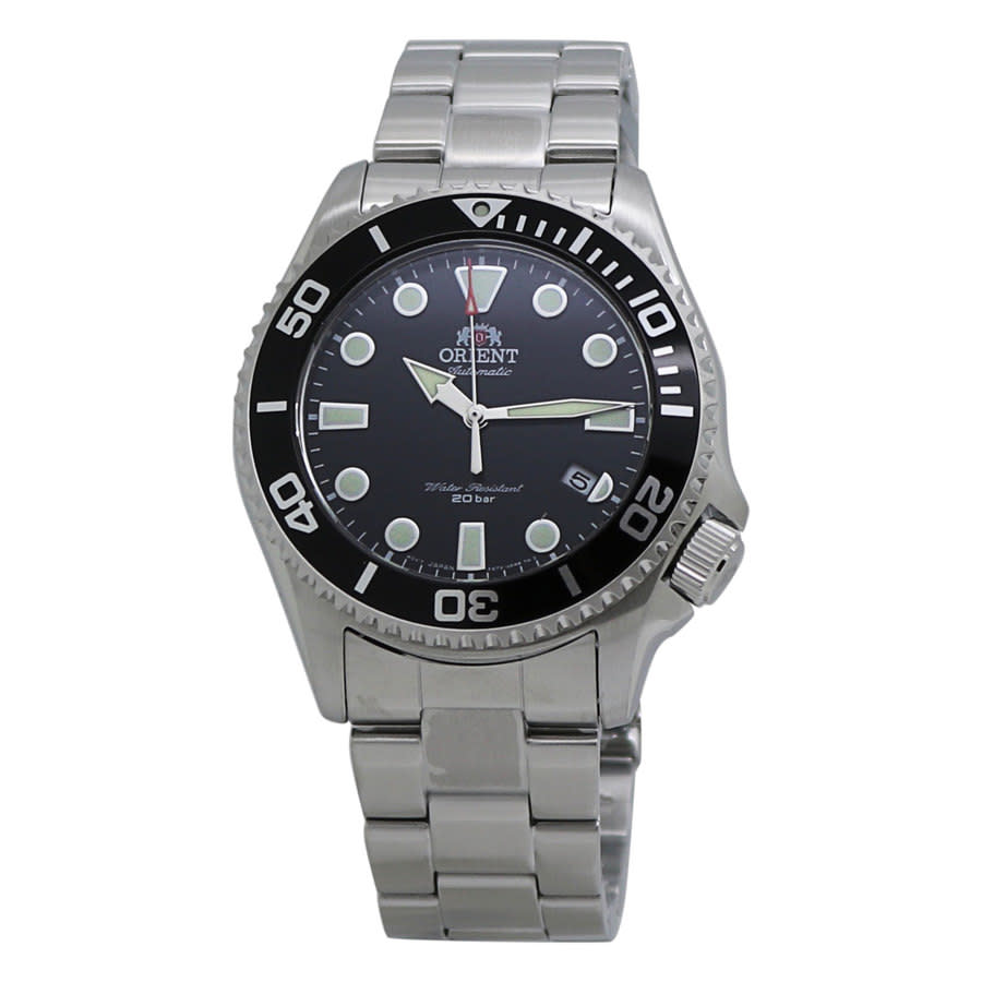 Stainless steel case with a stainless steel bracelet. Uni-directional rotating stainless steel bezel with an inlaid black ring. Black dial with luminous silver-tone hands and index hour markers. Minute markers around the outer rim. Dial Type: Analog. Luminescent hands and markers. Date display at the 4 o'clock position. Automatic movement. Scratch resistant sapphire crystal. Screw down crown. Solid case back. Round case shape. Case size: 43 mm. Case thickness: 13 mm. Band width: 22 mm. Fold over clasp with a push button release. Water resistant at 200 meters / 660 feet. Functions: date, hour, minute, second. Triton Series. Dive watch style. Watch label: Japan Movt. Orient Triton Automatic Black Dial Mens Watch RA-AC0K01B10B.