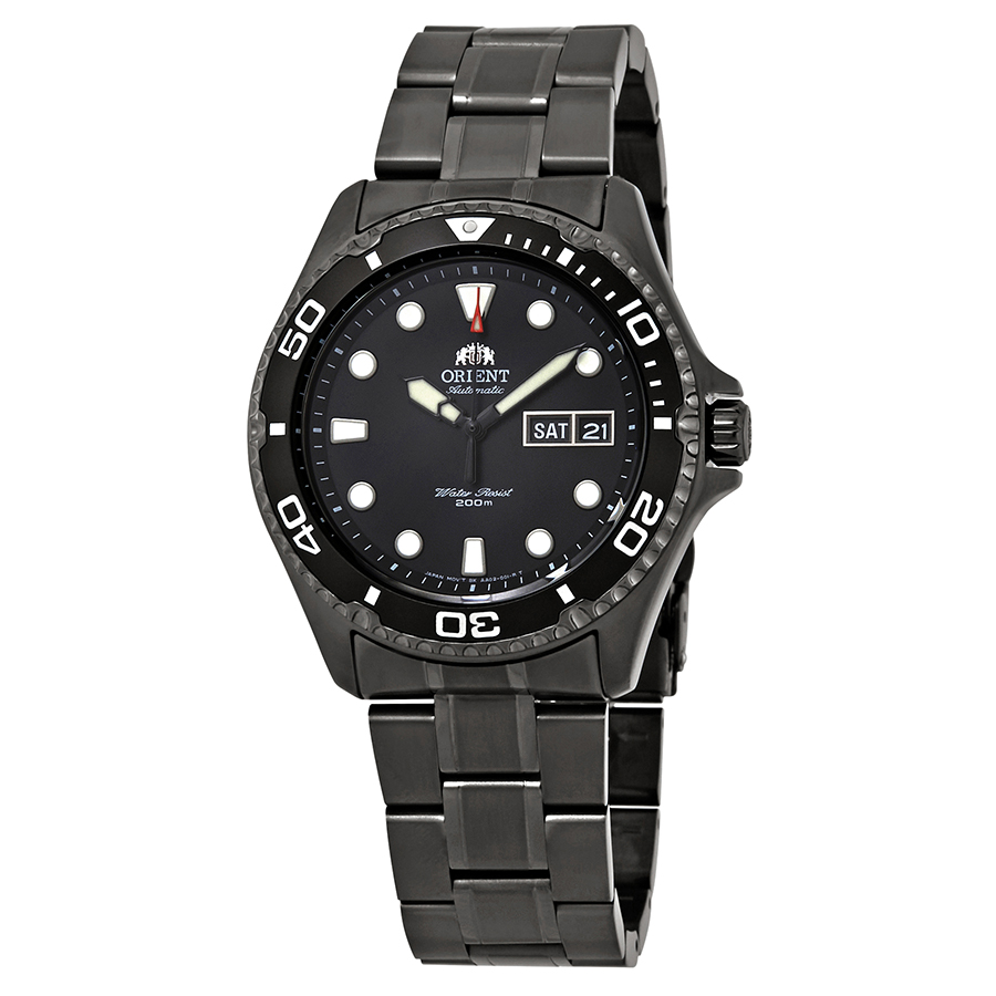Black ion-plated stainless steel case and bracelet. Uni-directional rotating (120-click) black ion-plated stainless steel bezel. Black dial with luminous black hands and dot hour markers. Minute markers around the outer rim. Dial Type: Analog. Luminescent hands and markers. Day of the week and date display at the 3 o'clock position. Orient Calibre F6922 Automatic movement, containing 22 Jewels, bitting at 21600 vph, and has a power reserve of approximately 40 hours. Scratch resistant mineral crystal. Screw down crown. Solid case back. Round case shape, case size: 41.5 mm, case thickness: 13 mm. Band width: 22 mm. Fold over clasp with a safety release. Water resistant at 200 meters / 660 feet. Functions: date, day, hour, minute, second. Ray Raven II Series. Dive watch style. Watch label: Japan Movt. Orient Ray Raven II Automatic Black Dial Mens Watch FAA02003B9.