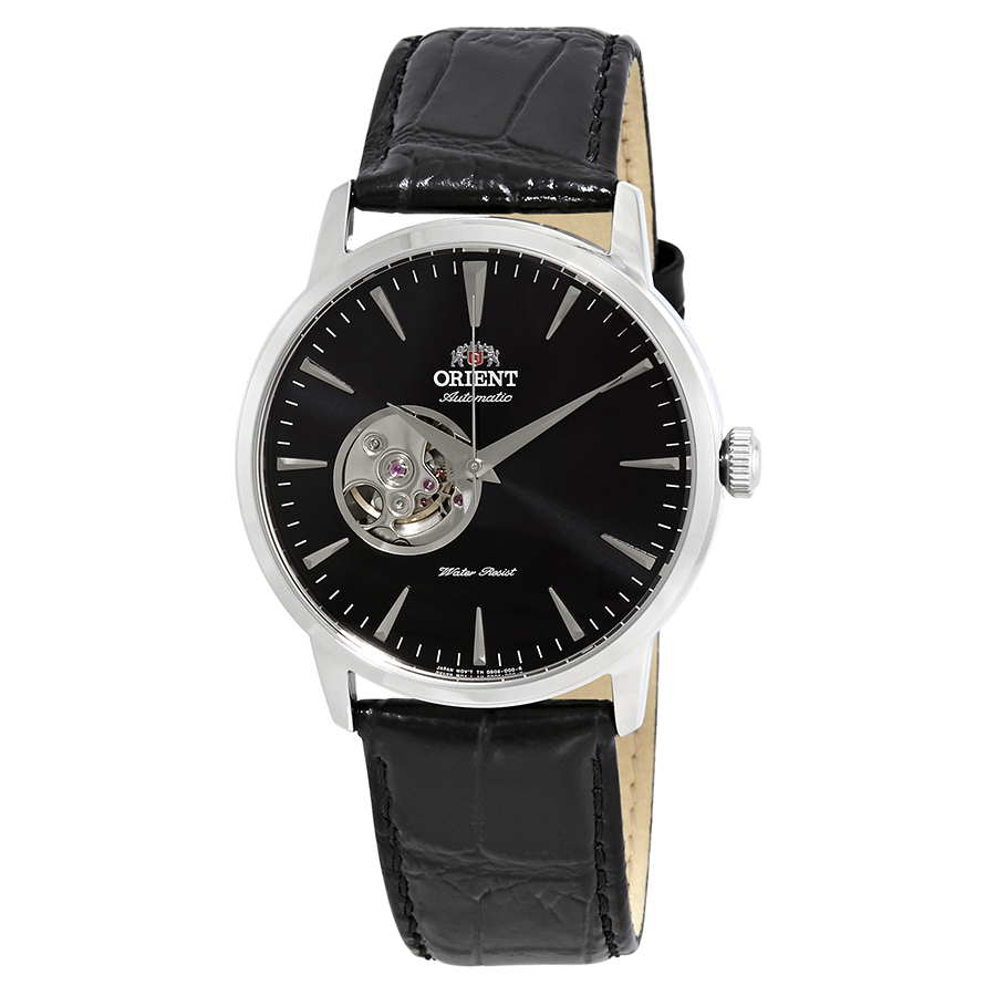 Stainless steel case with a black leather strap. Fixed stainless steel bezel. Black (open heart) dial with silver-tone hands and index hour markers. Minute markers around the outer rim. Dial Type: Analog. Orient calibre 46A40 automatic movement with a 40-hour power reserve. Scratch resistant mineral crystal. Pull / push crown. Solid case back. Round case shape. Case size: 41 mm. Case thickness: 11.9 mm. Band width: 21 mm. Tang clasp. Water resistant at 50 meters / 165 feet. Functions: hour, minute, second. Casual watch style. Watch label: Japan Movt. Orient Esteem Automatic Black Dial Mens Watch FDB08004B0.