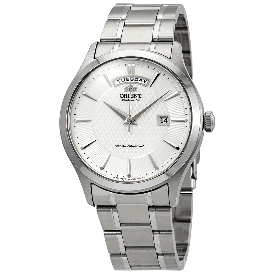 Stainless steel case with a stainless steel bracelet. Fixed stainless steel bezel. White dial with silver-tone hands and index hour markers. Minute markers around the outer rim. Dial Type: Analog. Date display at the 3 o'clock position. Day of the week display centered on the 12 o'clock position. Orient calibre 46E40 automatic movement with a 40-hour power reserve. Scratch resistant mineral crystal. Pull / push crown. Solid case back. Round case shape. Case size: 41 mm. Case thickness: 13 mm. Band width: 21 mm. Fold over clasp. Water resistant at 50 meters / 165 feet. Functions: date, day, hour, minute, second. Casual watch style. Watch label: Japan Movt. Orient Classic Automatic White Dial Mens Watch FEV0V001WH.