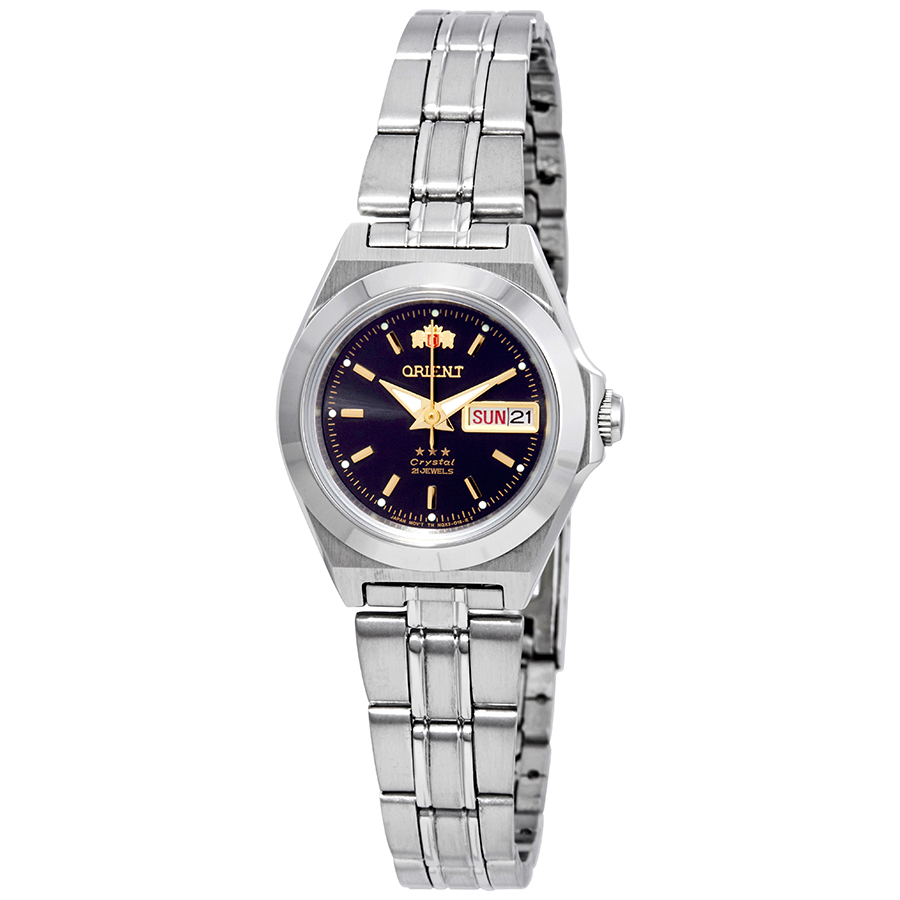 Stainless steel case with a stainless steel bracelet. Fixed stainless steel bezel. Black dial with luminous gold-tone hands and index hour markers. Minute markers around the outer rim. Dial Type: Analog. Luminescent hands. Day of the week and date display at the 3 o'clock position. Automatic movement. Scratch resistant mineral crystal. Pull / push crown. Solid case back. Round case shape. Case size: 25 mm. Case thickness: 10 mm. Deployment clasp. Water resistant at 50 meters / 165 feet. Functions: date, day, hour, minute, second. Casual watch style. Watch label: Japan Movt. Orient Tri Star Automatic Black Dial Ladies Watch FNQ1A00AB.