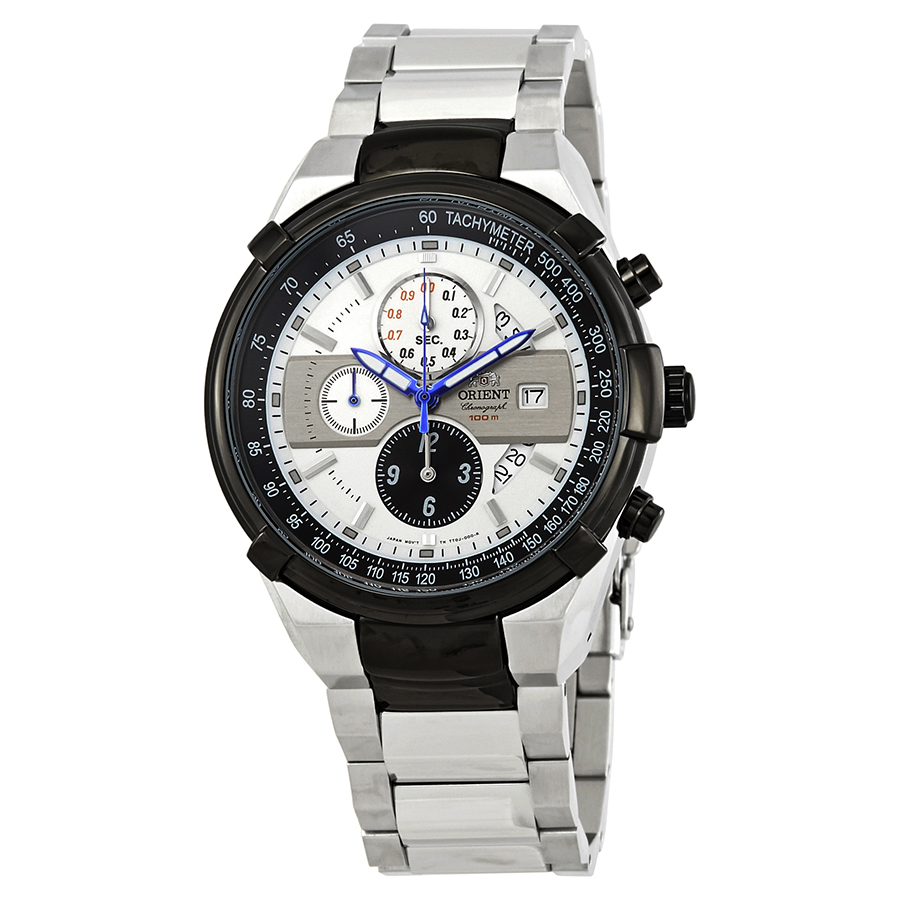 Stainless steel case with a stainless steel bracelet. Fixed black PVD bezel. Silver dial with luminous black hands and index hour markers. Minute markers. Tachymeter markings around the outer rim. Dial Type: Analog. Luminescent hands and markers. Date display at the 3 o'clock position. Chronograph - three sub-dials displaying: 12 hour/ 60 minute, 60 second, 1/20 second. Orient Calibre KFB00 quartz movement. Scratch resistant mineral crystal. Screw down crown. Solid case back. Round case shape. Case size: 43.5 mm. Case thickness: 11.42 mm. Band width: 14 mm. Fold over clasp with a safety release. Water resistant at 100 meters / 330 feet. Functions: chronograph, tachymeter, date, hour, minute, second. Sport watch style. Watch label: Japan Movt. Orient Leader Chronograph Silver Dial Mens Watch FTT0J003W0.