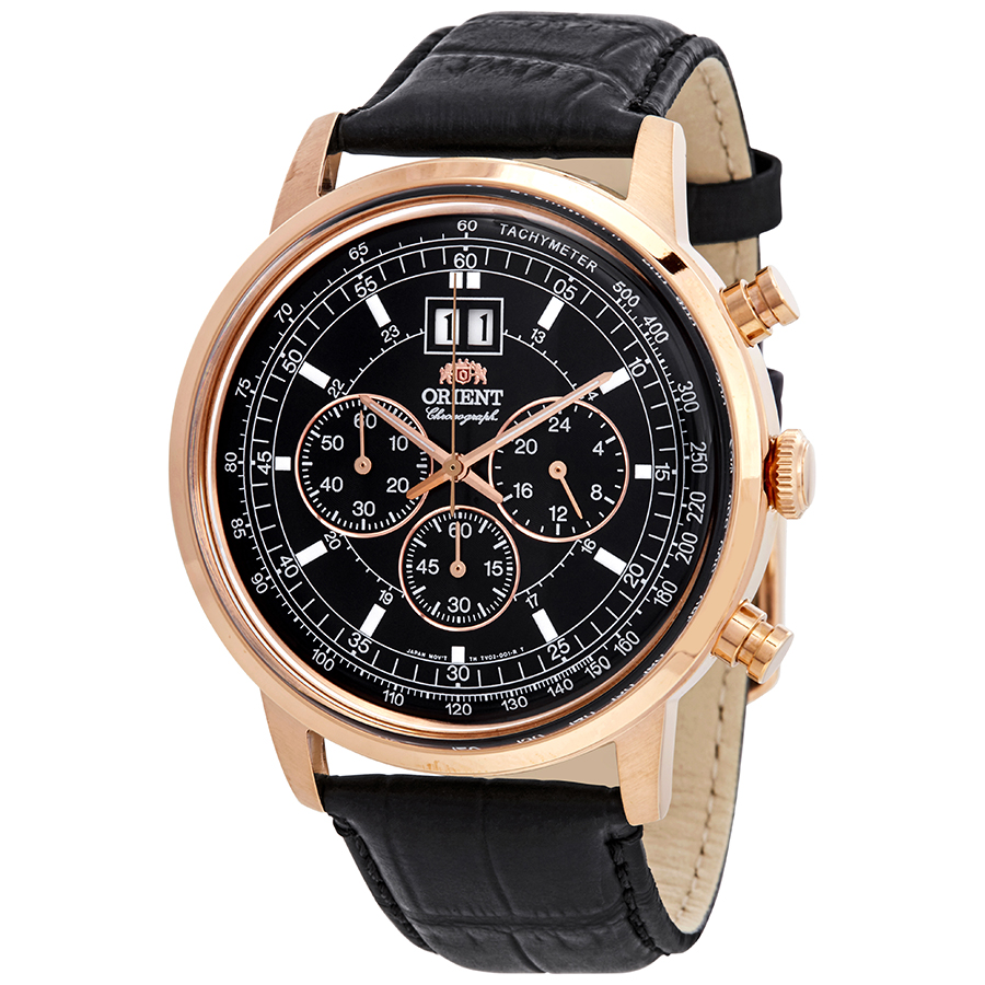 Gold-tone stainless steel case with a black leather strap. Fixed gold-tone stainless steel bezel. Black dial with luminous gold-tone hands and index hour markers. 24 hour markers. Minute markers. Tachymeter markings around the outer rim. Dial Type: Analog. Luminescent hands and markers. Date display below the 12 o'clock position. Chronograph - three sub-dials displaying: 60 second, 60 minute and 24 hour. Orient calibre KFC00 quartz movement. Scratch resistant mineral crystal. Pull / push crown. Solid case back. Round case shape. Case size: 45 mm. Case thickness: 12.35 mm. Band width: 20 mm. Tang clasp. Water resistant at 50 meters / 165 feet. Functions: chronograph, tachymeter, big date, hour, minute, small second. Sport watch style. Watch label: Japan Movt. Orient Classic Chronograph Black Dial Mens Watch FTV02002B0.