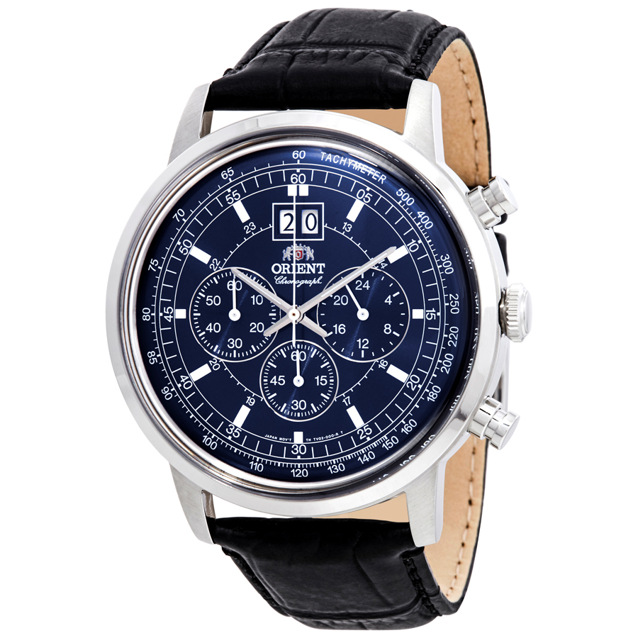 Stainless steel case with a black leather strap. Fixed stainless steel bezel. Blue dial with luminous black hands and index hour markers. Minute markers. 24 hour markers. Tachymeter markings around the outer rim. Dial Type: Analog. Luminescent hands and markers. Date display below the 12 o'clock position. Chronograph - three sub-dials displaying: 60 second, 60 minute and 24 hour. Orient calibre KFC00 quartz movement. Scratch resistant mineral crystal. Pull / push crown. Solid case back. Round case shape. Case size: 45 mm. Case thickness: 12.35 mm. Band width: 20 mm. Tang clasp. Water resistant at 50 meters / 165 feet. Functions: chronograph, tachymeter, 24 hour, big date, hour, minute, small second. Sport watch style. Watch label: Japan Movt. Orient Classic Chronograph Blue Dial Mens Watch FTV02003D0.