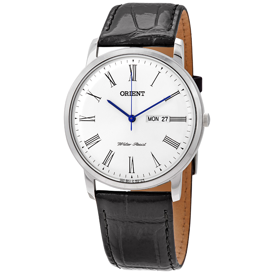 Stainless steel case with a black leather strap. Fixed stainless steel bezel. White dial with blue hands and Roman numeral hour markers. Minute markers around the outer rim. Dial Type: Analog. Day of the week and date display at the 3 o'clock position. Orient calibre HS911 quartz movement. Scratch resistant mineral crystal. Pull / push crown. Solid case back. Round case shape. Case size: 40 mm. Case thickness: 8 mm. Band width: 20 mm. Tang clasp. Water resistant at 50 meters / 165 feet. Functions: date, day, hour, minute, second. Casual watch style. Watch label: Japan Movt. Orient Capital Version 2 White Dial Mens Watch FUG1R009W6.