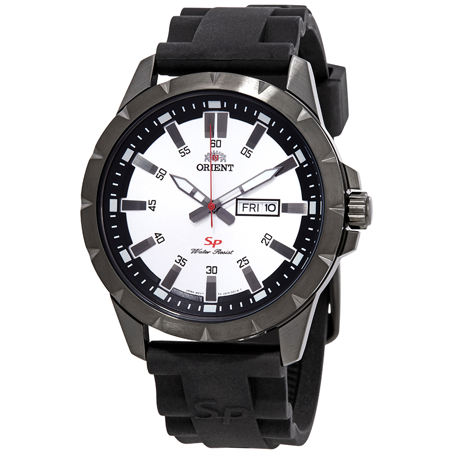 Black ion-plated stainless steel case with a black silicone strap. Fixed black ion-plated stainless steel bezel. White and black dial with luminous grey hands and index hour markers. Minute markers around the outer rim. Dial Type: Analog. Luminescent hands and markers. Day of the week and date display at the 3 o'clock position. Quartz movement. Scratch resistant mineral crystal. Pull / push crown. Solid case back. Round case shape, case size: 43 mm, case thickness: 9 mm. Band width: 22 mm. Tang clasp. Water resistant at 50 meters / 165 feet. Functions: date, day, hour, minute, second. Casual watch style. Watch label: Japan Movt. Orient SP Day and Date White and Black Dial Mens Watch FUG1X006W9.