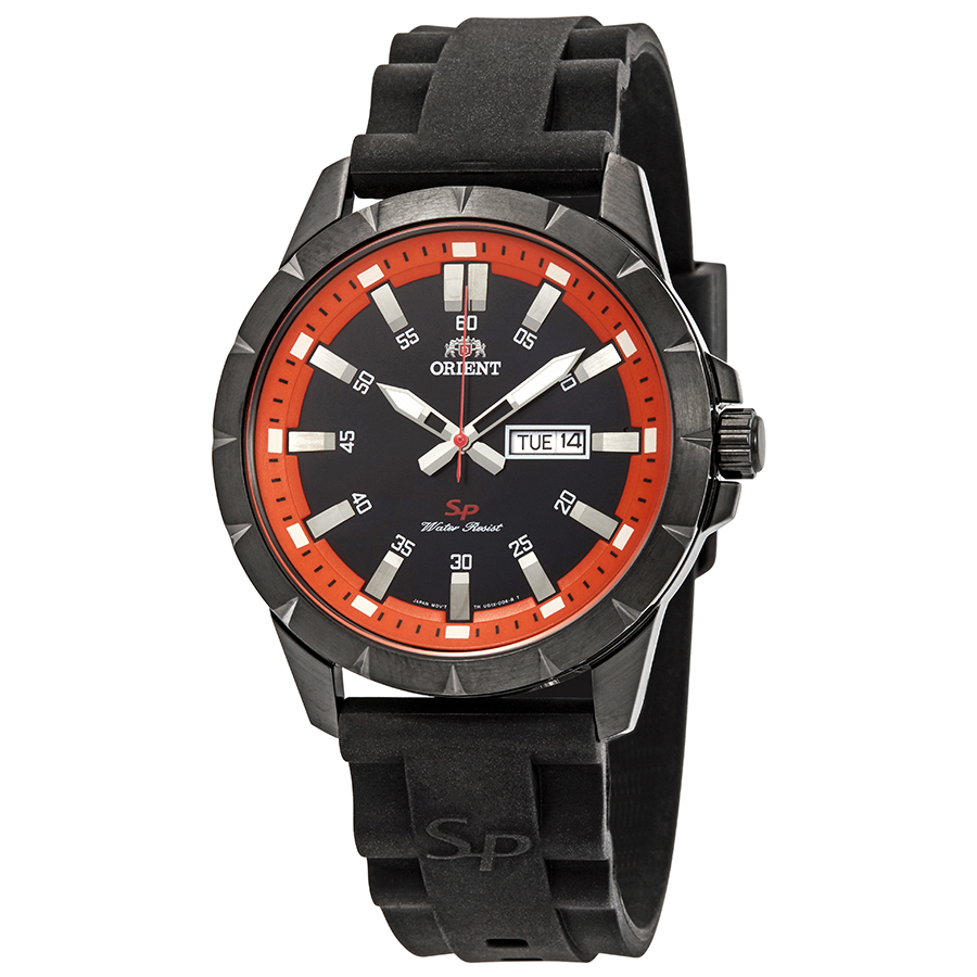 Black ion-plated stainless steel case with a black silicone strap. Fixed black ion-plated stainless steel bezel. Black and orange dial with luminous grey hands and index hour markers. Arabic numeral minute markers (at 5 minute intervals). Minute markers around the outer rim. Dial Type: Analog. Luminescent hands and markers. Day of the week and date display at the 3 o'clock position. Quartz movement. Scratch resistant mineral crystal. Pull / push crown. Solid case back. Round case shape. Case size: 43 mm. Case thickness: 9 mm. Band width: 22 mm. Tang clasp. Water resistant at 50 meters / 165 feet. Functions: date, day, hour, minute, second. Casual watch style. Watch label: Japan Movt. Orient SP Day and Date Black and Orange Dial Mens Watch FUG1X009B9.