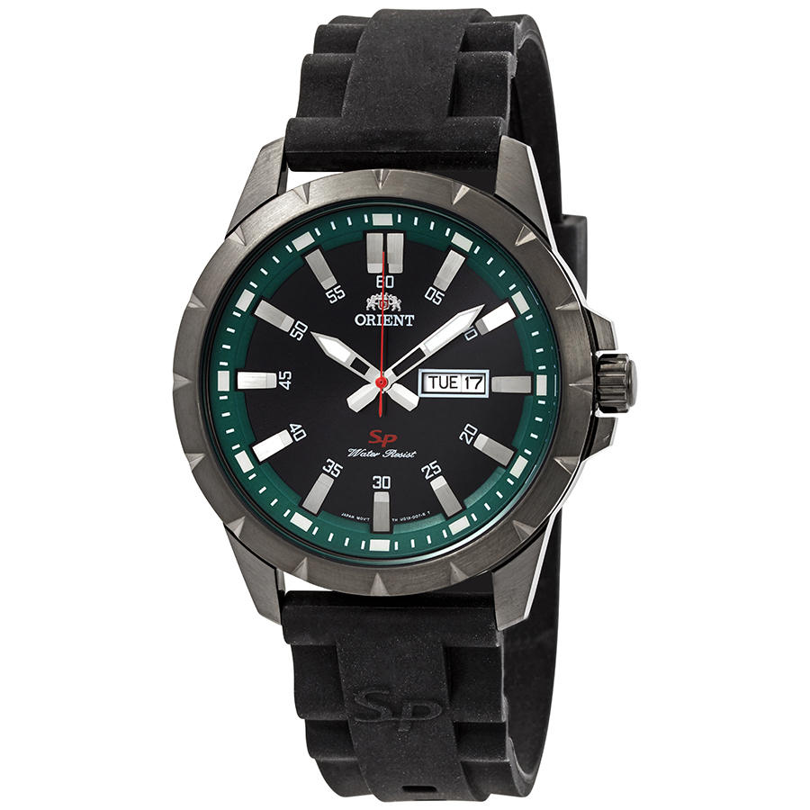 Black PVD stainless steel case with a black rubber strap. Fixed black PVD bezel. Black dial with luminous silver-tone hands and index hour markers. Minute markers around the outer rim. Dial Type: Analog. Luminescent hands and markers. Day of the week and date display at the 3 o'clock position. Quartz movement. Scratch resistant mineral crystal. Pull / push crown. Solid case back. Round case shape. Case size: 43 mm. Case thickness: 9 mm. Tang clasp. Water resistant at 50 meters / 165 feet. Functions: date, day, hour, minute, second. Sport watch style. Watch label: Japan Movt. Orient Sporty Black Dial Mens Watch FUG1X00AB.