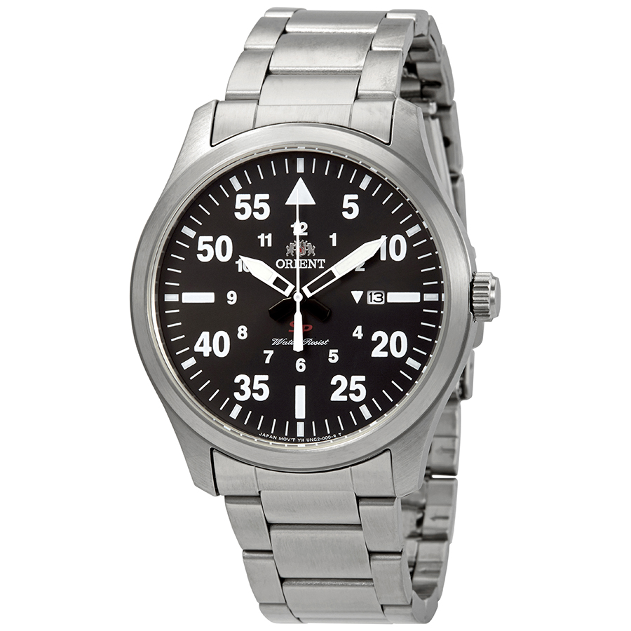 Stainless steel case with a stainless steel bracelet. Fixed stainless steel bezel. Black dial with luminous silver-tone hands and small Arabic numeral hour markers. Arabic numeral minute markers (at 5 minute intervals). Minute markers around the outer rim. Dial Type: Analog. Luminescent hands and markers. Date display at the 3 o'clock position. Quartz movement. Scratch resistant mineral crystal. Pull / push crown. Solid case back. Round case shape. Case size: 42 mm. Case thickness: 10 mm. Band width: 22 mm. Fold over clasp. Water resistant at 50 meters / 165 feet. Functions: date, hour, minute, second. Casual watch style. Watch label: Japan Movt. Orient SP Black Dial Mens Watch FUNG2001B0.