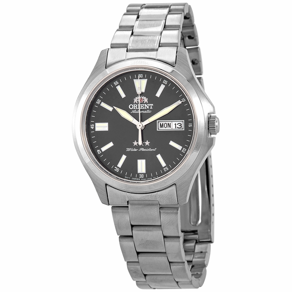 Stainless steel case with a stainless steel bracelet. Fixed stainless steel bezel. Grey dial with luminous silver-tone hands and index hour markers. Arabic numeral minute markers (at 5 minute intervals). Minute markers around the outer rim. Dial Type: Analog. Luminescent hands and markers. Day of the week and date display at the 3 o'clock position. Automatic movement. Scratch resistant mineral crystal. Pull / push crown. Solid case back. Round case shape. Case size: 40 mm. Case thickness: 11.2 mm. Band width: 20 mm. Fold over clasp with a push button release. Water resistant at 30 meters / 100 feet. Functions: date, day, hour, minute, second. Tristar Series. Casual watch style. Orient TriStar Automatic Grey Dial Mens Watch RA-AB0F10 N.