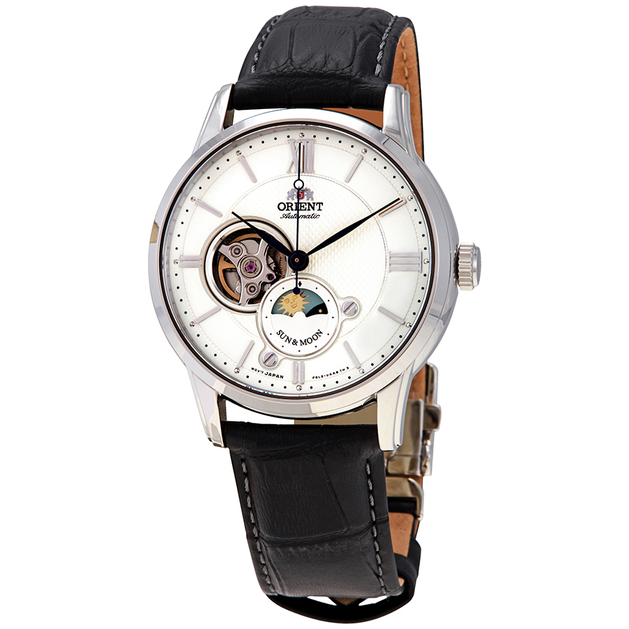 Stainless steel case with a black leather strap. Fixed stainless steel bezel. Silver (open heart) dial with black hands and index hour markers. Roman numerals mark the 3 and 12 o'clock positions. Minute markers around the outer rim. Dial Type: Analog. Sun and moon sub-dial. Orient calibre F6L24 automatic movement. Scratch resistant sapphire crystal. Pull / push crown. Transparent case back. Round case shape. Case size: 41 mm. Case thickness: 14 mm. Band width: 20 mm. Tang clasp. Water resistant at 50 meters / 165 feet. Functions: hour, minute, second, day/night indicator. Casual watch style. Watch label: Japan Movt. Orient Classic Sun and Moon Open Heart Automatic Silver Dial Mens Watch RA-AS0005S10B.