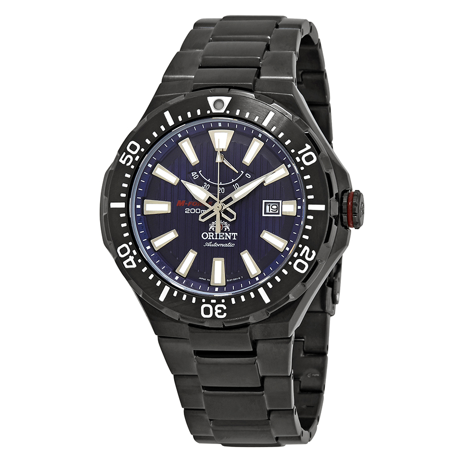 Black ion-plated stainless steel case with a black ion-plated stainless steel bracelet. Uni-directional rotating black ion-plated stainless steel bezel. Midnight blue dial with luminous silver-tone hands and index hour markers. Minute markers around the outer rim. Dial Type: Analog. Luminescent hands and markers. Date display at the 3 o'clock position. Power reserve subdials. Orient Calibre 40N5A automatic movement with a 40-hour power reserve. Scratch resistant sapphire crystal. Pull / push crown. Solid case back. Round case shape, case size: 49.1 mm, case thickness: 13.6 mm. Band width: 24 mm. Deployment clasp. Water resistant at 200 meters / 660 feet. Functions: date, hour, minute, second. Additional Info: : in general, suitable for high-impact water sports and scuba diving at depths not requiring mixed-gas. Casual watch style. Watch label: Japan Movt. Orient M-Force Delta Automatic Midnight Blue Dial Mens Watch SEL07001D0.