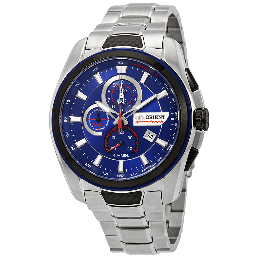Stainless steel case with a stainless steel bracelet. Fixed black ion-plated bezel. Blue dial with luminous silver-tone hands and index hour markers. Minute markers. Tachymeter markings around the inner rim. Dial Type: Analog. Luminescent hands and markers. Date display at the 4 o'clock position. Chronograph - three sub-dials displaying: 60 second, 40 minute and 1/100th of a second. Quartz movement. Scratch resistant sapphire crystal. Screw down crown. Solid case back. Round case shape. Case size: 46 mm. Case thickness: 10.6 mm. Band width: 24 mm. Fold over clasp. Water resistant at 100 meters / 330 feet. Functions: chronograph, tachymeter, date, hour, minute, second. Casual watch style. Orient Speedtech Blue Dial Mens Watch STZ00001D0.