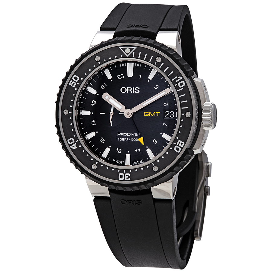 Titanium case with a black rubber strap. Uni-directional rotating stainless steel bezel with a black ceramic ring and a black rubber outer rim. Black dial with luminous silver-tone hands and index hour markers. 24 hour markers. Minute markers around the outer rim. Dial Type: Analog. Luminescent hands and markers. Date display at the 3 o'clock position. Oris Caliber 748 base SW220-1 automatic movement with a 38-hour power reserve. Scratch resistant sapphire crystal. Screw down crown. Solid case back. Round case shape. Case size: 49 mm. Case thickness: 15 mm. Band width: 26 mm. Deployment clasp. Water resistant at 1000 meters / 3300 feet. Functions: GMT, second time zone, hour, minute, second, date. Sport watch style. Watch label: Swiss Made. Oris ProDiver GMT Automatic Black Dial Mens Watch 01 748 7748 7154-07 4 26 74TEB.