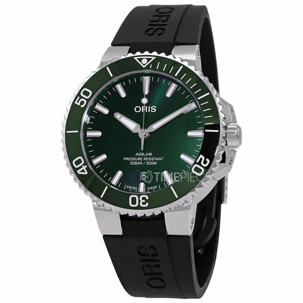 Stainless steel case with a black rubber strap. Uni-directional rotating stainless steel bezel with an inlaid green ceramic ring. Green dial with luminous silver-tone hands and index hour markers. Minute markers around the outer rim. Dial Type: Analog. Luminescent hands and markers. Date display at the 6 o'clock position. Oris calibre 733 automatic movement, based upon Sellita SW200-1, containing 26 Jewels, bitting at 28800 vph, and has a power reserve of approximately 38 hours. Anti-reflective scratch resistant sapphire crystal. Screw down crown. Transparent case back. Round case shape. Case size: 41.5 mm. Band width: 22 mm. Fold over clasp with a push button release. Water resistant at 300 meters. Functions: date, hour, minute, second. Aquis Series. Casual watch style. Watch label: Swiss Made. Oris Aquis Automatic Green Dial Mens Watch 01 733 7766 4157-07 4 22 64FC.