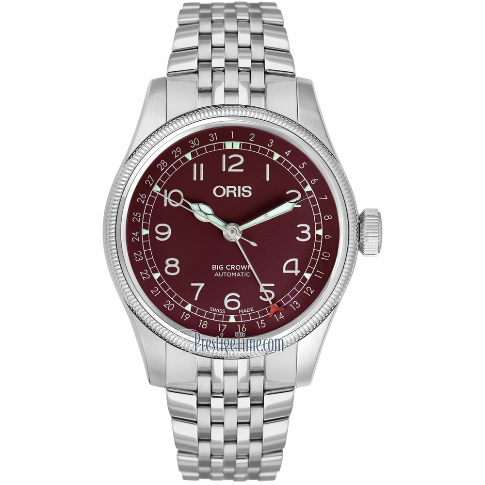 Silver-tone stainless steel case and bracelet. Fixed silver-tone stainless steel bezel. Red dial with silver-tone hands and Arabic numeral hour markers. Minute markers around the outer rim. Dial Type: Analog. Luminescent hands and markers. Pointer date. Oris Calibre 754, base SW 200-1 Automatic movement, based upon SW 200-1, containing 26 Jewels, bitting at 28800 vph, and has a power reserve of approximately 38 hours. Anti-reflective scratch resistant sapphire crystal. Screw down crown. Transparent case back. Round case shape, case size: 40 mm, case thickness: 11.70 mm. Push button folding clasp. Water resistant at 50 meters / 150 feet. Functions: date, hour, minute, second. Big Crown Series. Casual watch style. Watch label: Swiss Made. Oris Big Crown Automatic Red Dial Watch 01 754 7741 4068-07 8 20 22.