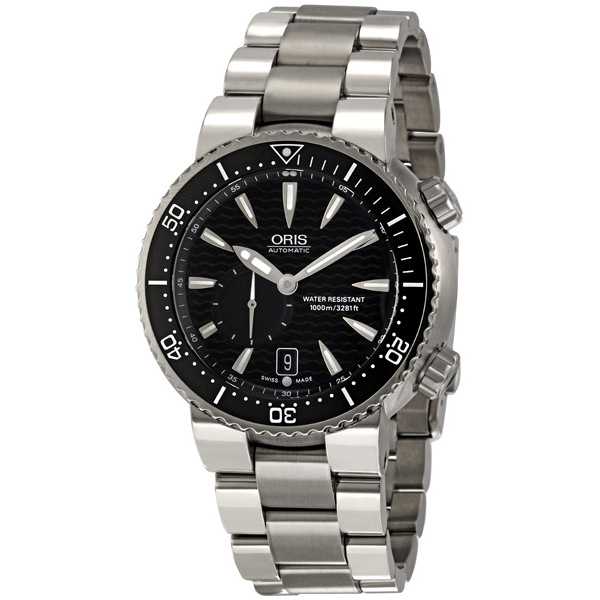 Grey titanium case with a grey titanium bracelet. Unidirectional rotating - 60 minute diving scale black stainless steel bezel. Black dial with luminous hands and index hour markers. Minute markers around the outer rim. Dial Type: Analog. Luminescent hands and markers. Date display at the 6 o'clock position. Seconds sub-dial at the 8 o'clock position subdials. Oris Calibre 643, base ETA 2836-2 automatic movement with a 38-hour power reserve. Scratch resistant sapphire crystal. Screw down crown. Screw down case back. Round case shape, case size: 44 mm, case thickness: 15.25 mm. Band width: 24 mm. Deployment clasp. Water resistant at 1000 meters / 3300 feet. Functions: hours, minutes, seconds, calendar. Dive watch style. Watch label: Swiss Made. Item Variations: Oris 643 7637 7454 MB, 64376377454MB, 643.7637.7454.MB. Oris Divers Mens Automatic Watch 643-7637-7454MB.