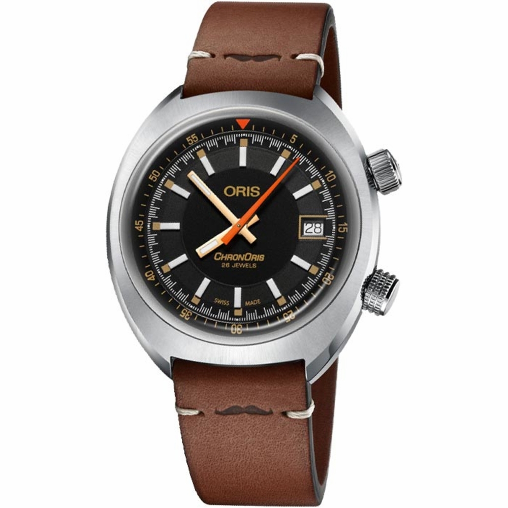 Silver-tone stainless steel case with a brown calfskin leather strap. Fixed silver-tone stainless steel bezel. Black dial with silver-tone hands and index hour markers. Minute markers around the outer rim. Dial Type: Analog. Luminescent hands and markers. Date display at the 3 o'clock position. Oris Calibre 733, Automatic movement, based upon SW 200-1, containing 26 Jewels, bitting at 28800 vph, and has a power reserve of approximately 38 hours. Anti-reflective scratch resistant sapphire crystal. Screw down crown. Solid case back. Round case shape, case size: 39 mm. Tang buckle clasp. Water resistant at 100 meters / 330 feet. Functions: date, hour, minute, second. Limited Edition Series. Casual watch style. Watch label: Swiss Made. Oris Limited Edition Automatic Black Dial Watch 01 733 7737 4034-Set LS.